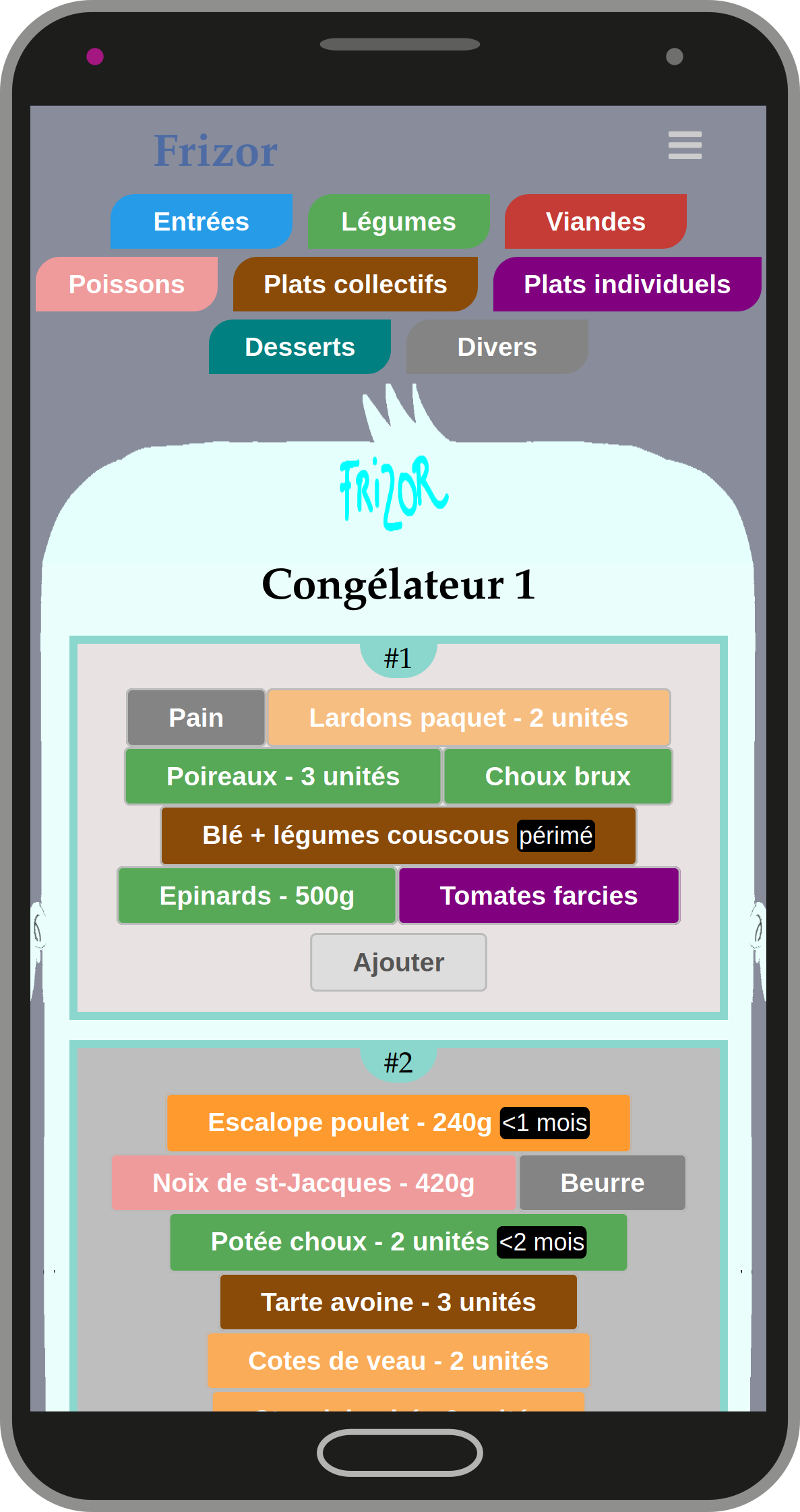 Paramétrez vos catégories : nom, couleurs, sous-catégories. Cela permet de trier et visualiser le contenu de votre congélateur par catégorie.